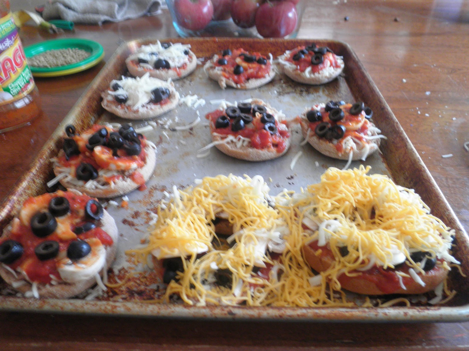 They each took their turn making their own and putting them on the baking pan. I made Princess' and my own (I used bagels for myself and didn't go for the ladybug look, lol).